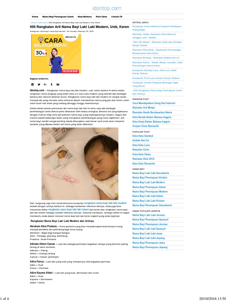 Semoga ulasan di atas bisa memberikan. Rangkaian nama bayi laki laki unik islami dan artinya 2 kata. Rekomendasi nama bayi laki laki islami modern unik awalan huruf k serta artinya. Anda bisa menggabungkan dua atau tiga nama di bawah ini sebagai nama lengkap putra kecil anda. Nama warna juga bagus untuk nama anak. Asslkm wr wb, tolong carikan nama untuk anak laki2 kami,yg ada gabungan nama ibu riska dwi anggesti dan nama ayah pandji, terima kasih. Daftar isi 5 nama bayi laki laki modern dari aktor amerika 5 nama anak laki laki dari karakter anime jepang beberapa referensi di bawah ini bisa dijadikan sebagai nama bayi laku laki unik dan indah. Kali ini kami akan membagikan nama anak bayi laki laki modern yang indah dan juga memiliki makna yang baik di baliknya. Nama bayi, nama arti kata benda dalam bahasa inggris nama bayi sendiri sangat penting sebab diharapkan saat besar nanti anak akan mewarisi kata kerja dalam. Selain itu, arti dalam namanya juga sangat bagus. Sebab, nama modern untuk jagoan kecil saat ini, sudah umum bagi para orang tua untuk memilih nama yang terdengar unik dan berbeda bagi buah hatinya. Tujuan penyusunan rangkaian ini sebagai inspirasi dan ide dalam mencari nama anak laki laki modern yang diharapkan mempunyai arti nama yang sesuai. Kumpulan nama bayi laki laki perempuan dan arti, 2 kata 3 suku kata, unik dan keren, turki, rusia, arab, sansekerta, italia terbaru 2020.